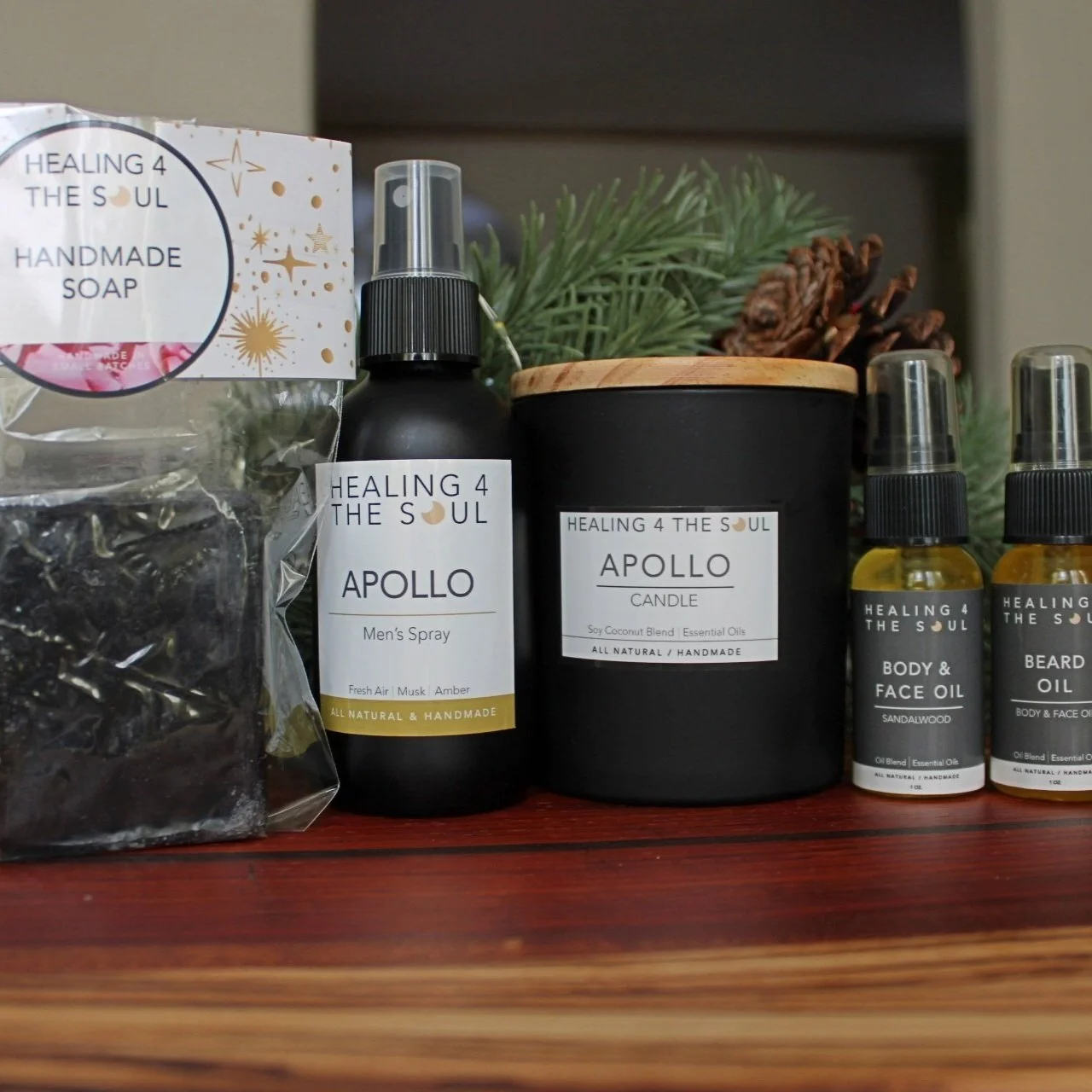 Set Contains: Beard Oil, Body & Face Oil, Large Body Spray, Handmade Charcoal Soap & Medium Candle.